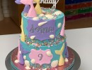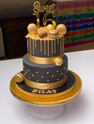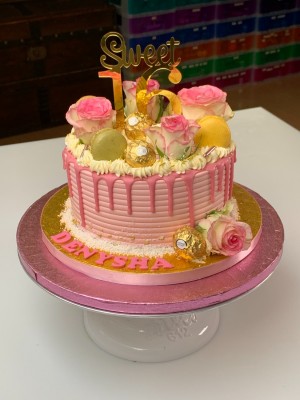 Bij stapeltaaarten kan een dripcake ook prima met een taart gecombineerd worden die met fondant is bekleed, dus niet beide taarten hoeven een drip te hebben.